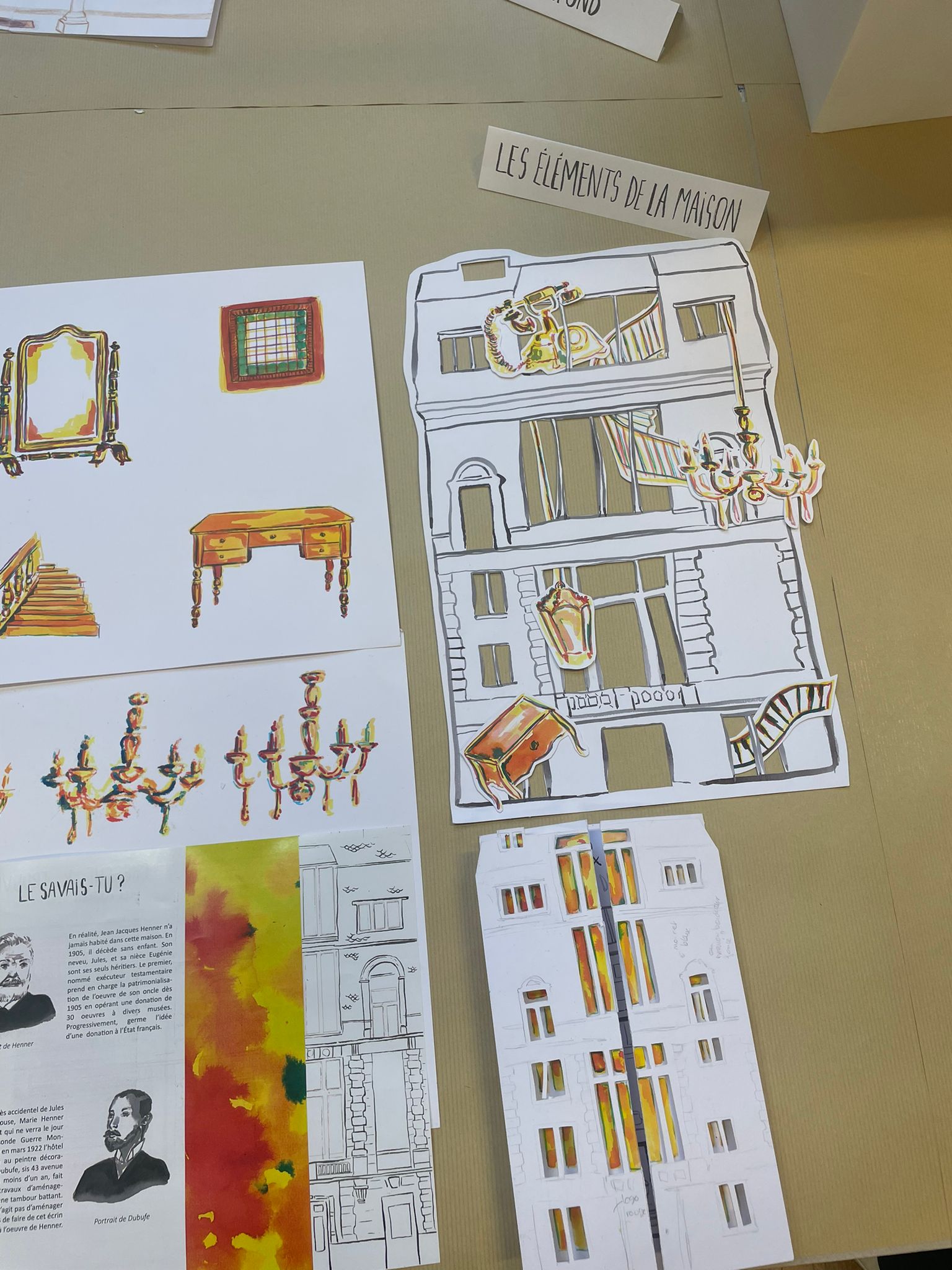 Il s’agissait de construire un projet de médiation sur 6 semaines (à raison de 10h de cours par semaine) selon les thématiques élaborées à partir des collections et de l’hôtel particulier soit des caractéristiques « henneriennes », les éléments de la maison, les couleurs du musée, le nu féminin, les nymphes et sorcières, les lumières, les motifs, les décors